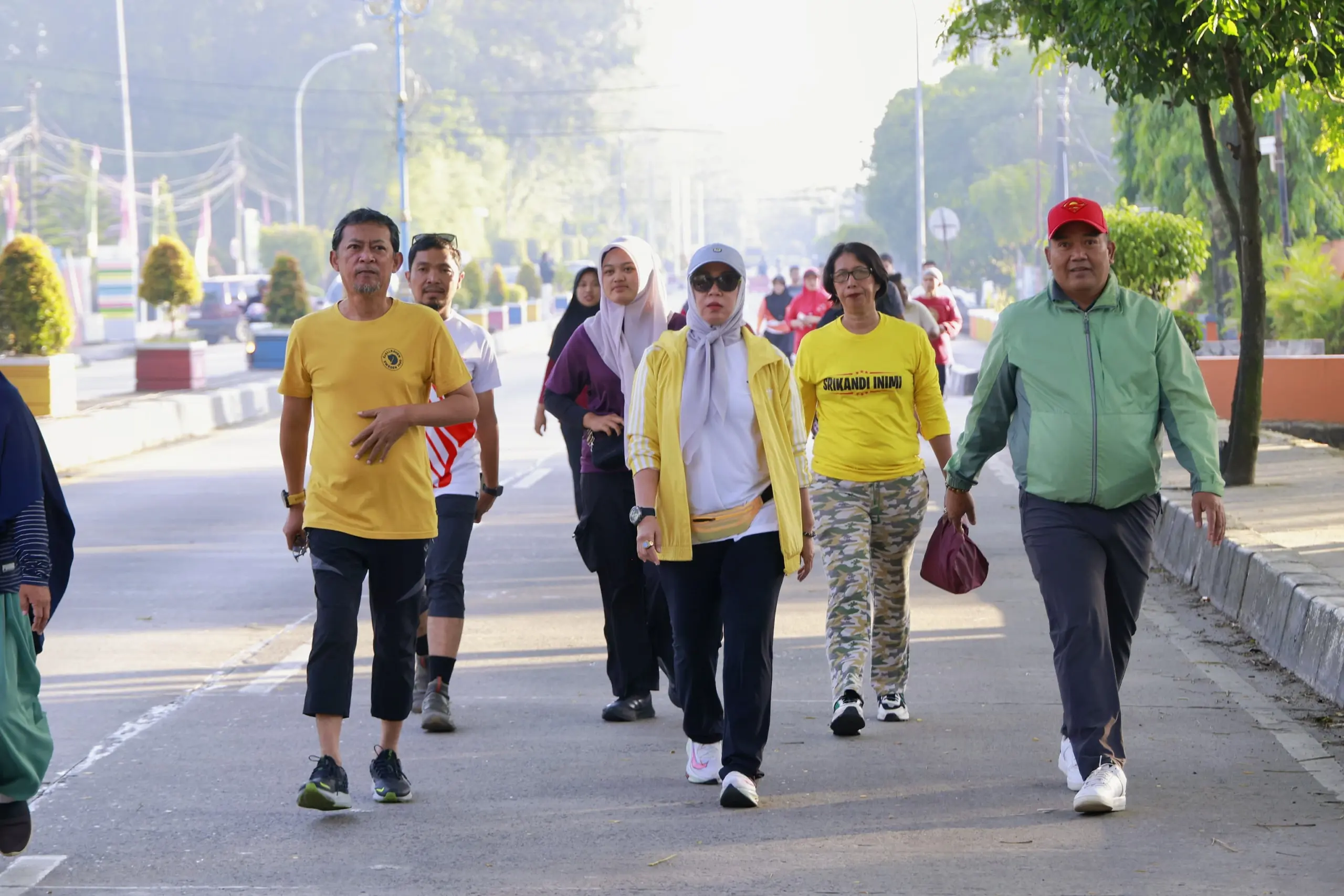 Dengan mengenakan busana olahraga santai, Bupati dan suami berjalan menyusuri ruas jalan utama alun-alun sambil menyapa dan berbaur akrab dengan warga.